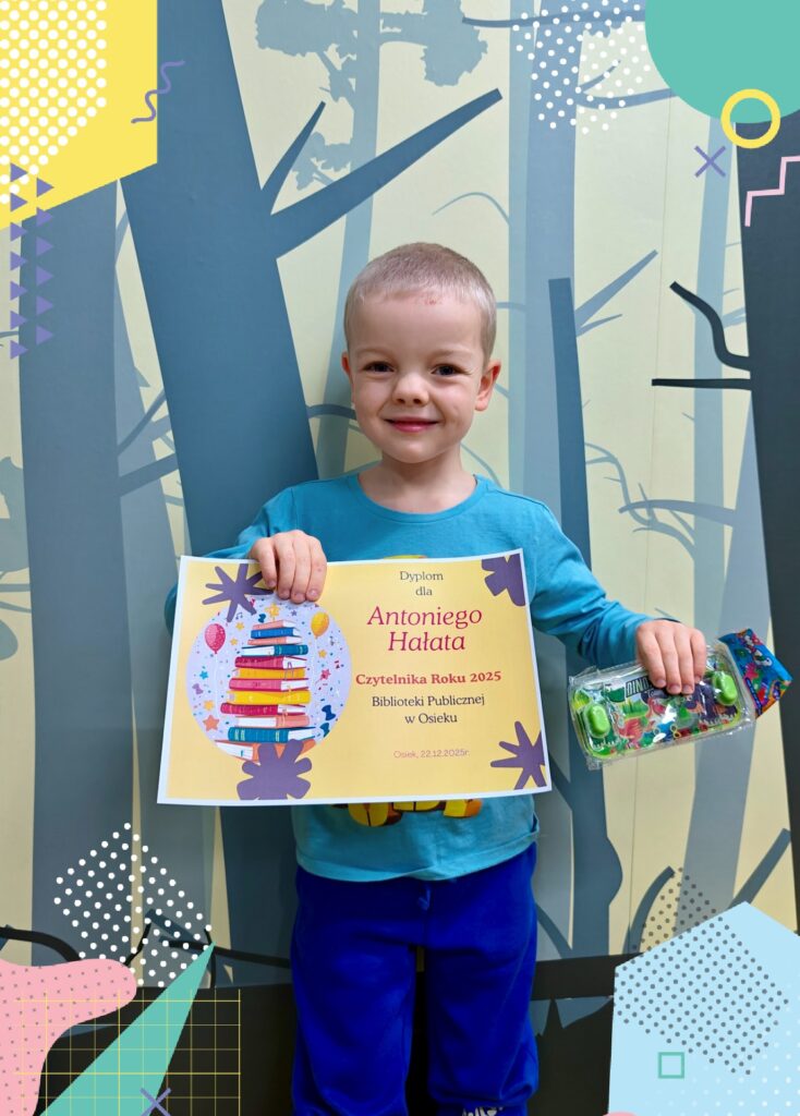 Z radością prezentujemy Czytelnika Roku 2025 Biblioteki Publicznej w Osieku – Antoniego Hałata. Według komputerowej ewidencji naszego systemu bibliotecznego Antoś i jego mama Monika wspólnie wypożyczyli i przeczytali w tym roku aż 522 książki dla dzieci! Gratulujemy im czytelniczej pasji i mamy nadzieję, że w kolejnym roku nasi czytelnicy i czytelniczki będą równie chętnie sięgać po biblioteczne zbiory.