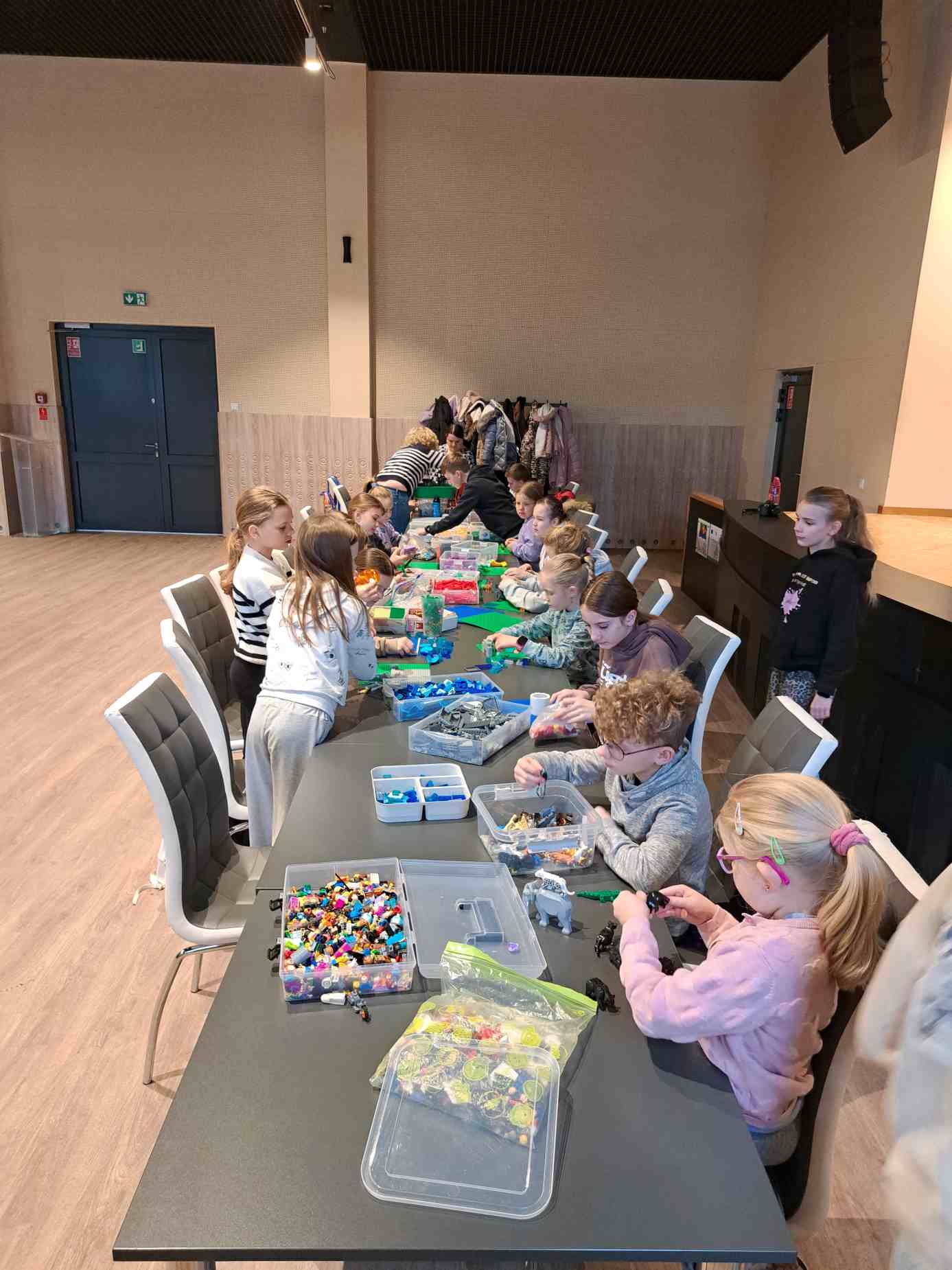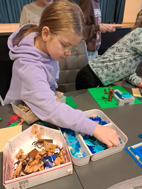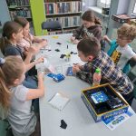 Drugiego dnia bibliotekę opanowały… klocki LEGO. Pani Asia z Klockarni przywiozła ich tyle, że wyobraźnia mogła pracować bez żadnych ograniczeń. Wśród dwudziestoosobowej grupy powstawały najróżniejsze konstrukcje – od fantastycznych budowli po niezwykłe pojazdy. Jedno było pewne: kreatywności nikomu nie brakowało.