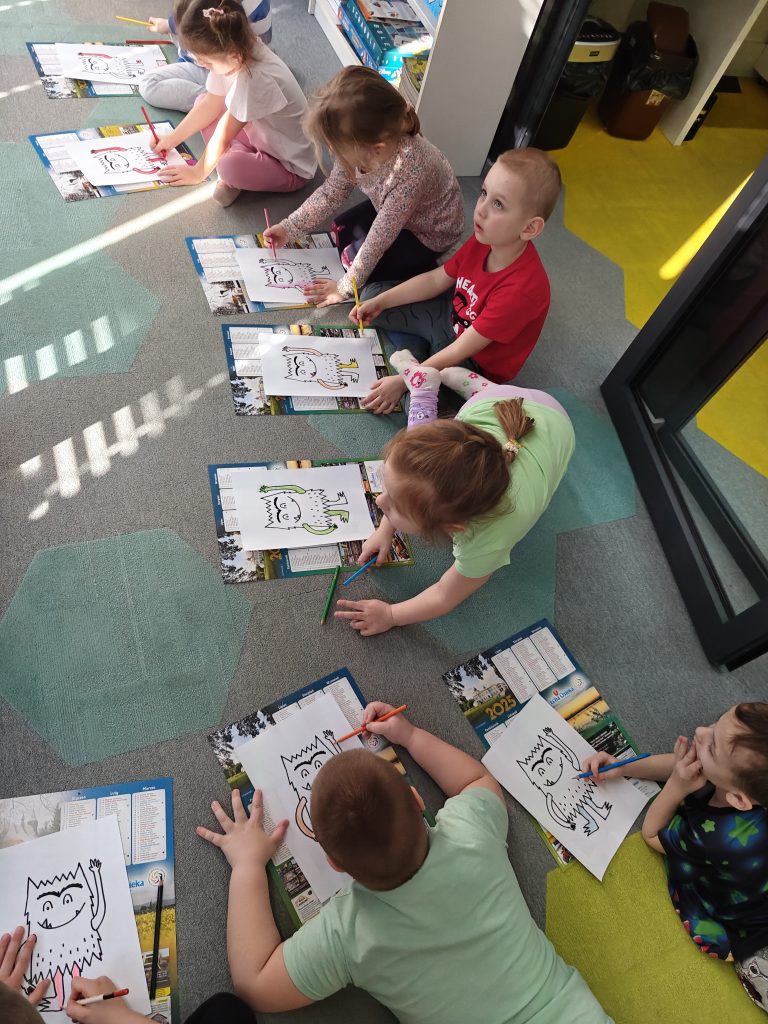 Na zakończenie dzieci pokolorowały rysunek Pazurzaka i ozdobiły go wybranymi przez siebie naklejkami z przyborami higienicznymi, które miały pomóc mu w codziennej pielęgnacji. Powstały kolorowe i piękne prace, które mali artyści z dumą prezentowali do wspólnego zdjęcia.