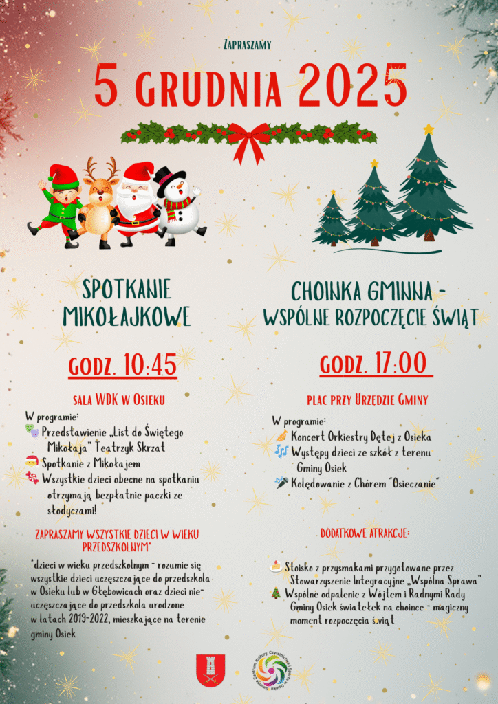 Gminne Centrum Kultury, Czytelnictwa i Sportu w Osieku serdecznie zaprasza mieszkańców na wyjątkowe wydarzenia, które wprowadzą nas w magiczny klimat zbliżających się Świąt Bożego Narodzenia. Już 5 grudnia 2025 roku odbędą się dwa świąteczne spotkania pełne atrakcji zarówno dla najmłodszych, jak i całych rodzin.